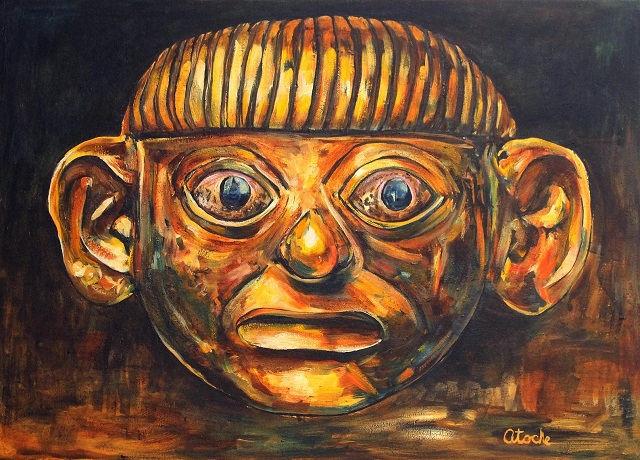 La sala principal de la exposición alberga Cenizas Culturales, una serie inspirada en la iconografía del antiguo Perú. Atoche, quien es conocido en Roma (ciudad donde reside desde 2003) por sus murales de acuarios y fondos marinos habitados por peces tropicales y vestigios del pasado, explica que ahora siente la necesidad de reencontrarse con sus raíces y desde 2018 ha vertido su experimentación artística en el estudio de la iconografía ancestral, reinventando y combinando imágenes de huacos, máscaras, cabezas clava, animales y guerreros con colores fluorescentes y fuertes pinceladas expresionistas, que nos muestran un lado más maduro de su producción pictórica.