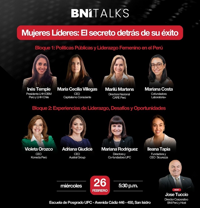 El evento es organizado, dirigido y moderado por José Tuccio, Director Corporativo de BNI Perú, quien cuenta con una trayectoria de 10 años en la organización, guiando conversaciones estratégicas de alto nivel. Acompañándolo estarán ocho destacadas líderes empresariales: