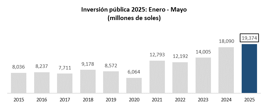 El resultado de la inversión pública acumulado a mayo también representó un incremento del 7% respecto al 2024, según información de Consulta Amigable del Ministerio de Economía y Finanzas (MEF).