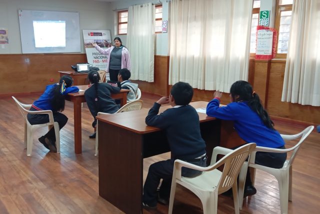 En la provincia limeña de Cajatambo, en el Tambo Nunumia del programa PAIS del Midis, la docente refuerza el aprendizaje del idioma inglés. Como ella, son cerca de 250 maestros los que fortalecen los conocimientos de sus alumnos en los Tambos a nivel nacional.