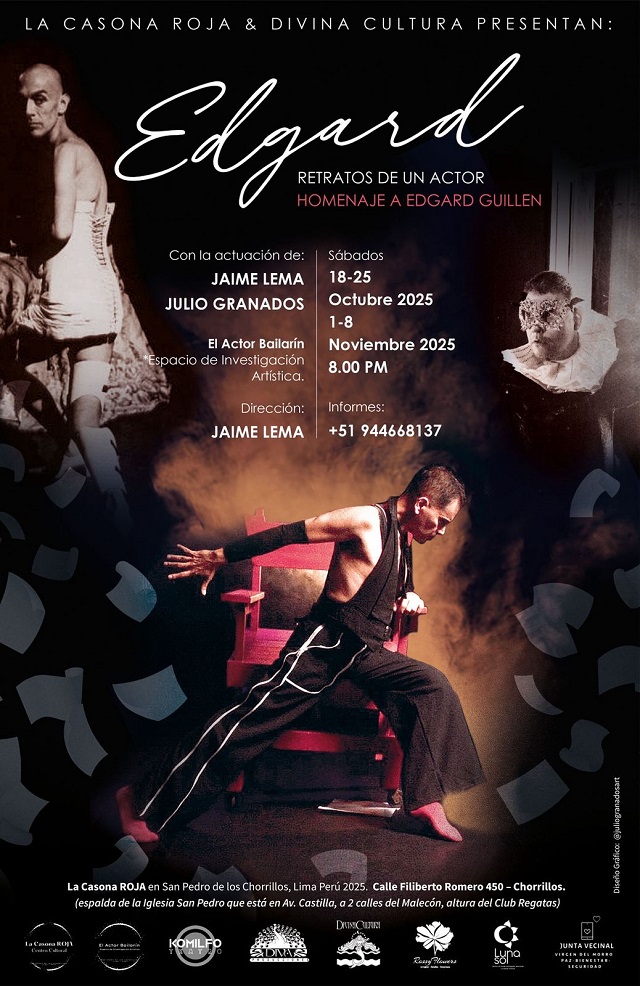 Lima, 03 de Octubre del 2025.- Edgard, Retratos de un Actor, la nueva creación dirigida por Jaime Lema, con la participación de Julio Granados, una pieza que rinde homenaje al gran Edgard Guillén, referente imprescindible del teatro peruano y universal; actor, director, dramaturgo, maestro, se estrenará el sábado 18 de octubre a las 8 pm. en La Casona Roja, ubicada en Romero 450, Chorrillos. Será el inicio de una breve pero importante temporada de cuatro sábados consecutivos.
