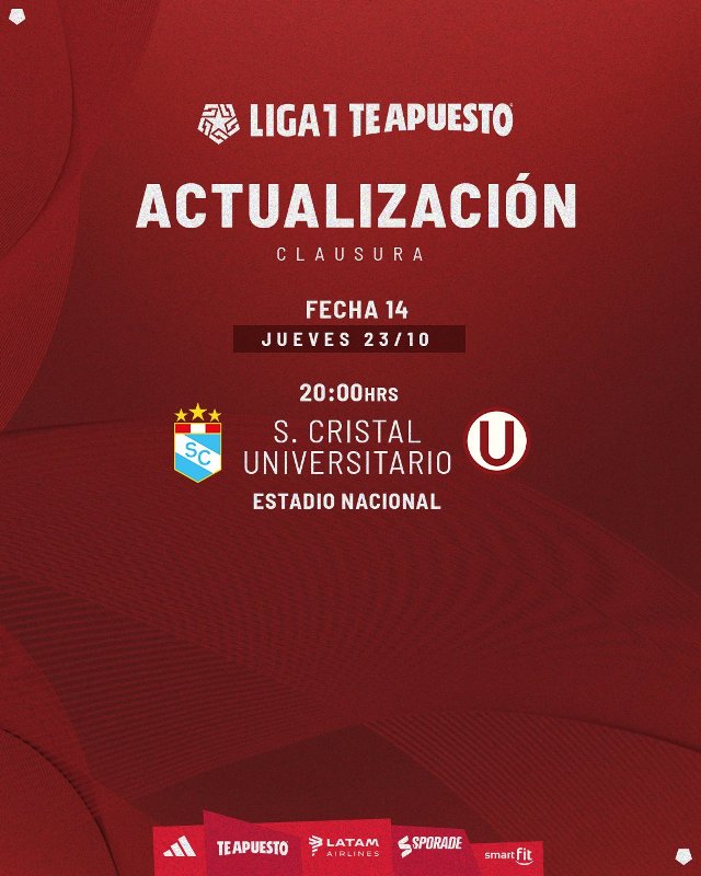 Lima, 14 de Octubre del 2025.- Mediante sus redes sociales, la Liga 1 hizo oficial la reprogramación del juego entre Cristal y Universitario. El partido Cristal vs. Universitario es reprogramado para el Jueves 23/10 a las 8 pm. en el Estadio Nacional de Lima.