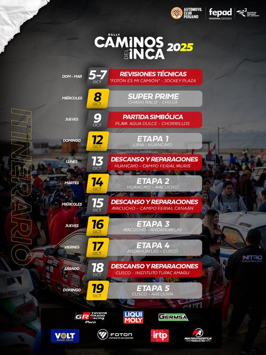 Como parte de las actividades oficiales de lo que será el Rally Caminos del Inca 2025, este 8 de octubre se realizará el Súper Prime Chaski Rally que se llevará a cabo en un circuito especial de tierra donde las noventa tripulaciones inscritas podrán poner a prueba sus máquinas.En esta oportunidad dos autos competirán en paralelo para que los espectadores tengan la oportunidad de conocer y disfrutar del manejo y la estrategia de sus pilotos favoritos.