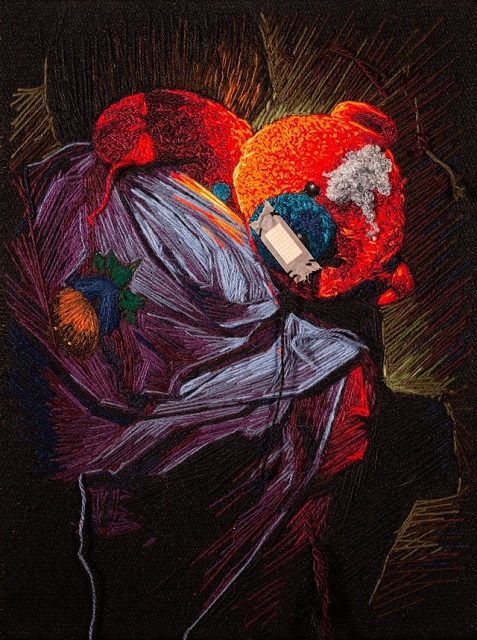 Por su parte, Eliseo Espeza y Jersson Chuquitaype destacan por su manejo técnico de la acuarela, con representaciones del paisaje rural y urbano de Ayacucho en proceso de transformación. Finalmente, Disney Medina emplea el bordado como medio artístico para abordar temas de denuncia social, como la violencia y el trauma, combinando elementos textiles tradicionales con un discurso contemporáneo.