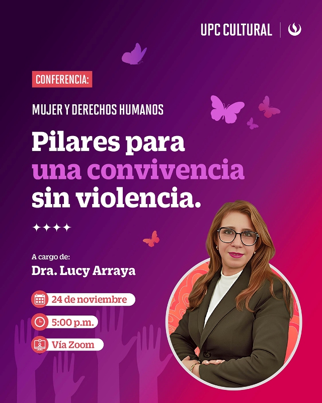Lima, 21 de Noviembre del 2025.- En el Perú, la violencia contra la mujer sigue en niveles alarmantes: el 53.8% de peruanas ha sufrido violencia física, psicológica o sexual, y en 2025 cada dos días una mujer fue víctima de feminicidio, en su mayoría jóvenes de 18 a 29 años. Frente a este escenario, UPC Cultural presentará este 24 de noviembre la conferencia “Mujer y derechos humanos: pilares para una convivencia sin violencia”, a cargo de la Dra. Lucy Arraya, quien abordará los desafíos, avances normativos y soluciones para enfrentar esta realidad.