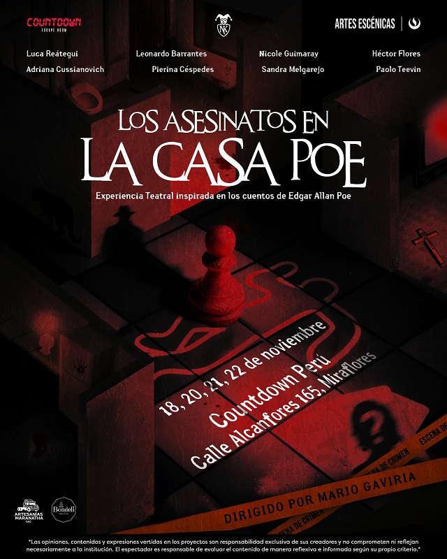 “Dirigir ‘La Casa Poe’ ha sido intenso. Hacer un recorrido inmersivo, con actuaciones y con escape room, creo que es un reto muy interesante de descifrar”, nos dice el director de la obra Mario Gaviria. “Además, contamos con el apoyo de uno de los mejores cuentistas de la historia, y probablemente el mayor exponente de los cuentos de terror clásicos: Edgar Allan Poe. En mi caso, creo que todo escritor lo admira, y el utilizar seis de sus cuentos más icónicos para construir este recorrido es todo un lujo. Trabajar con el equipo ha sido natural, como si nos conociéramos de antes. El elenco se ha conformado con naturalidad, y me ha permitido construir estos seis personajes-fantasmas, además de nuestros dos detectives que se encargarán de acompañarlos en este viaje”. Forma parte del elenco: Leonardo Barrantes, Luca Reátegui, Nicole Guimaray, Adriana Cussianovich, Héctor Flores, Sandra Melgarejo, Pierina Céspedes y Paolo Teevin.