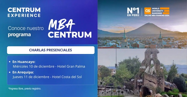 Lima, 04 de Diciembre del 2025.- Con el compromiso de acercar oportunidades de formación de alto nivel a más regiones del país, CENTRUM PUCP anuncia el Centrum Experience en Huancayo y Arequipa, encuentros presenciales donde los participantes podrán conocer de cerca nuestro MBA y descubrir las posibilidades reales de crecimiento profesional que ofrece.