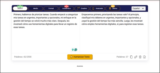 Una herramienta como Humanizar-texto.org también puede ayudar ajustando el tono de tu ensayo automáticamente, haciéndolo sonar menos formal y más accesible.