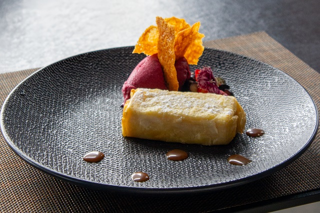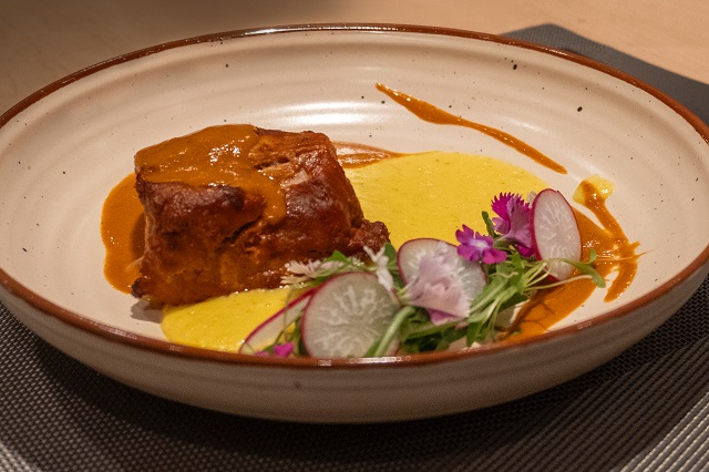 El menú inicia con la Causa del muelle, acompañada de un Sauvignon Blanc – Semillón que resalta los sabores marinos y la frescura de los ingredientes. Continúa con el Lomo viajero, donde un Malbec de taninos suaves se integra con el lomo grillado, la bearnaise y el huacatay.