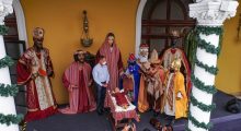 Vestidos de Reyes Magos, efectivos de la Policía Nacional dieron ofrendas al niño Jesús y, junto con el burgomaestre, entregaron regalos a los menores asistentes.