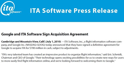 Google anunció que llegó a un acuerdo para adquirir ITA, una de las empresa de software de viajes aéreos líderes en Internet por US$700 millones.