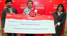 Ministra de Comercio Exterior y representante del BBVA Banco Continental, Carlo Reyes Cestti, posan junto a Edgar Asencios