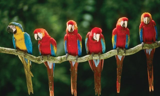 Famosos por su hermoso plumaje, los guacamayos, papagayos o aras, conforman los mayores miembros del vasto grupo de loros del Nuevo Mundo (Psitácidos). Los colores de su plumaje varía entre los colores azul, rojo, verde y amarillo; posee un pico fuerte en forma de gancho que el animal emplea como herramienta de corte y sujeción.